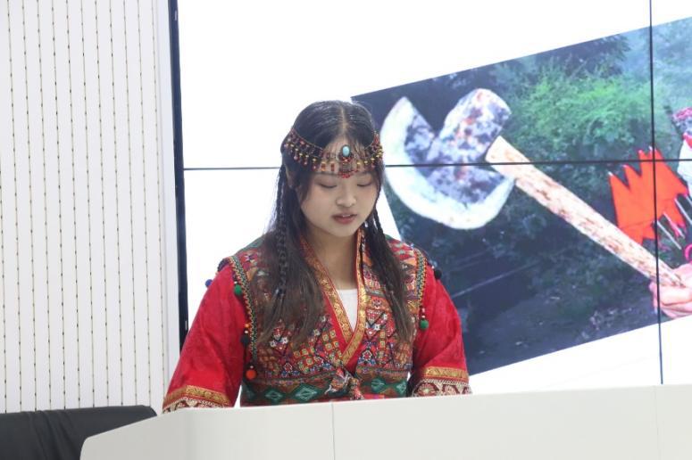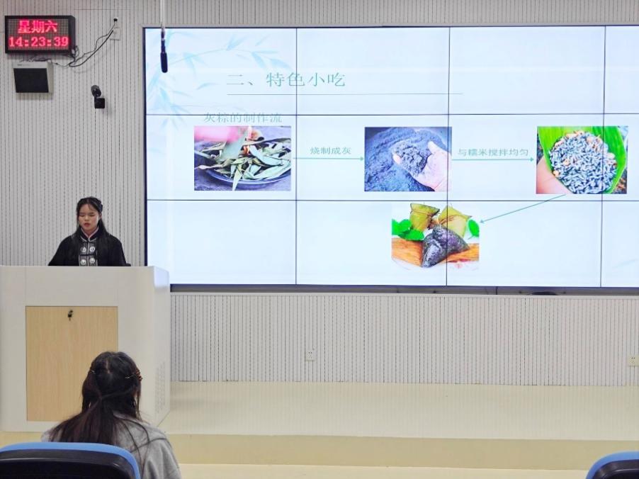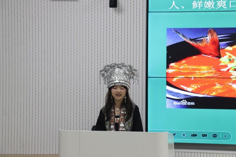 申张南同学分别从概况、文化、饮食、服饰和歌舞介绍仡佬族的民族文化。申张南同学首先介绍了仡佬族的一些概况,接着讲解了仡佬族的特色文化,如傩戏文化、丹砂文化和汉墓丧葬文化等。而后她又介绍了仡佬族的饮食,如油茶、糯米糍粑等。申张南同学也介绍了仡佬族的服饰,仡佬族服饰有无领对襟式、盘扣式和马面裙。最后申张南同学介绍了仡佬族的特色舞蹈。